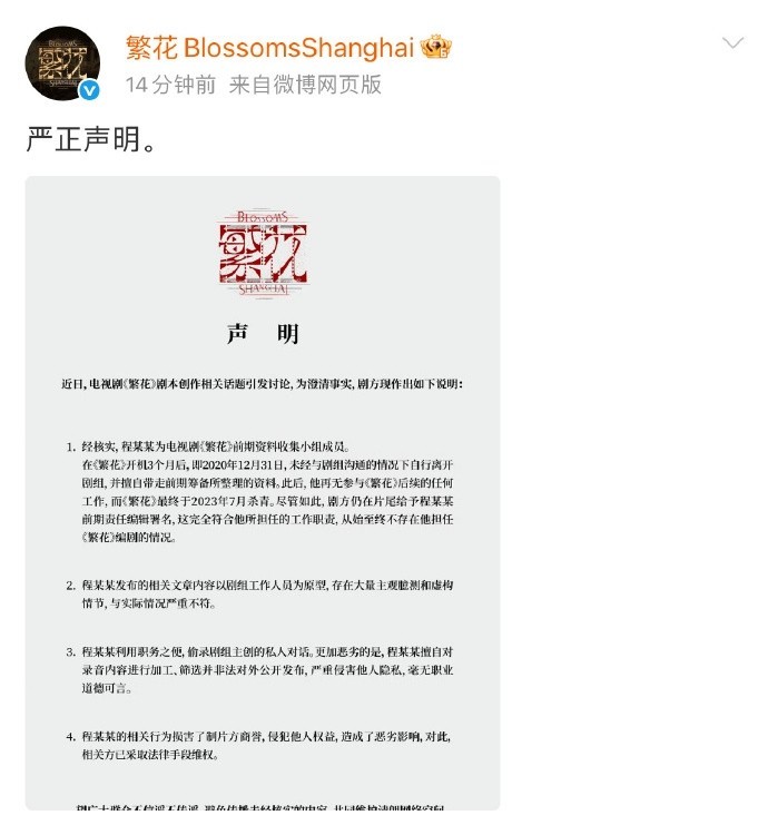 事件发酵之初,《繁花》官方曾多次发声澄清,声称古二是自行离组,且未经许可带走部分资料,行为不当。